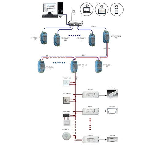 Communication distance:Ethernet Distance is no limit ( Can add HUB);SBUS 1200M;DALI 300M(Can add DALI repeater to extend the distance)