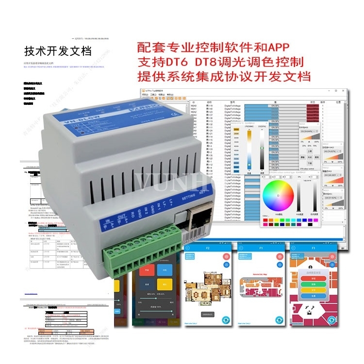 DALI gateway provides computer software+Android APP+development materials and communication protocols, as well as third-party system integration technical support services. It can be directly used in engineering or integrated into third-party smart home control systems or PLC HMI through communication protocols for control.